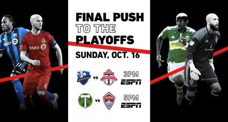 The final push to the playoffs has arrived, and ESPN has all the weekend action. First at 3pm ET, the Montreal Impact and Toronto FC square off, followed by the Portland Timbers vs the Colorado Rapids at 5pm ET. Plus, live look-ins across all of the day's matches.